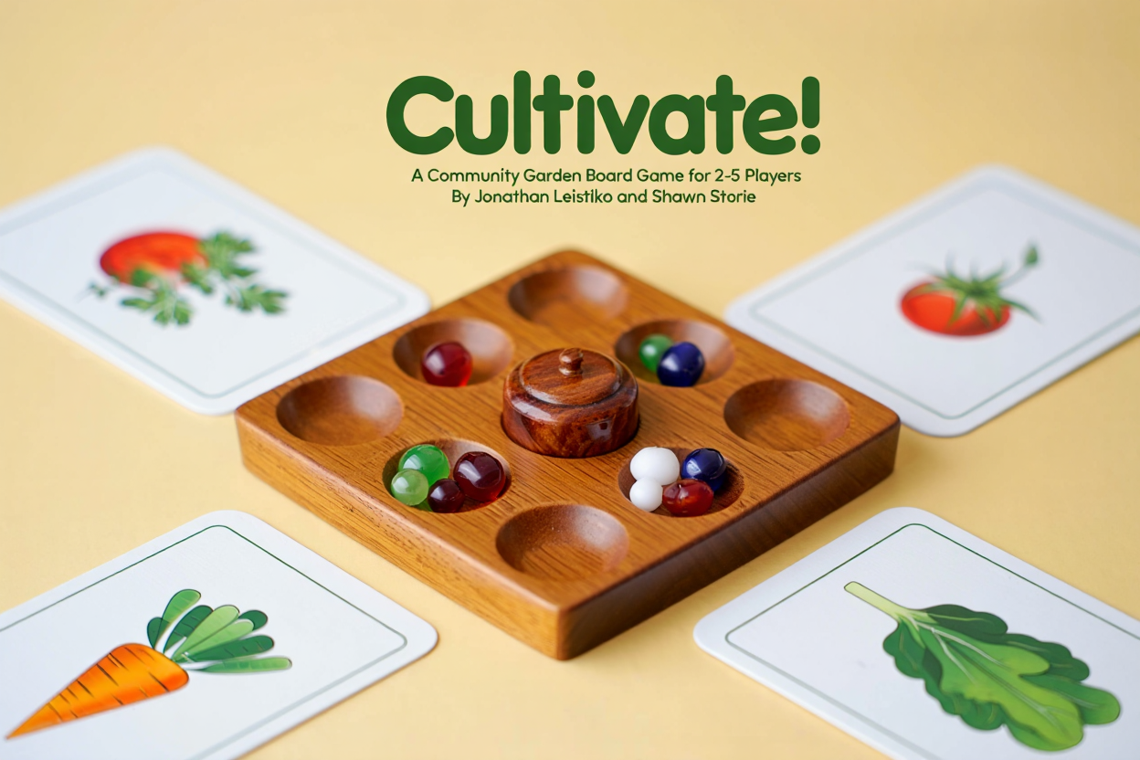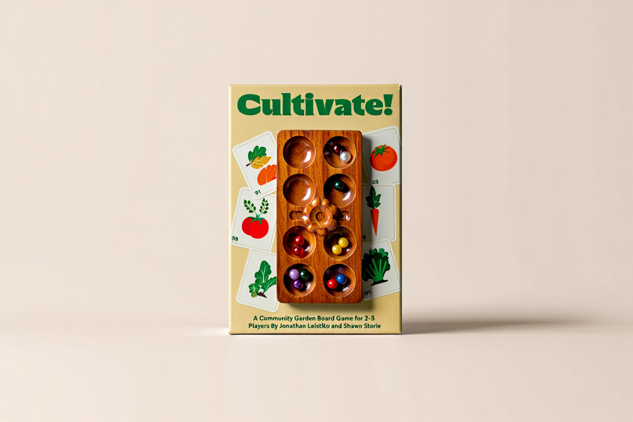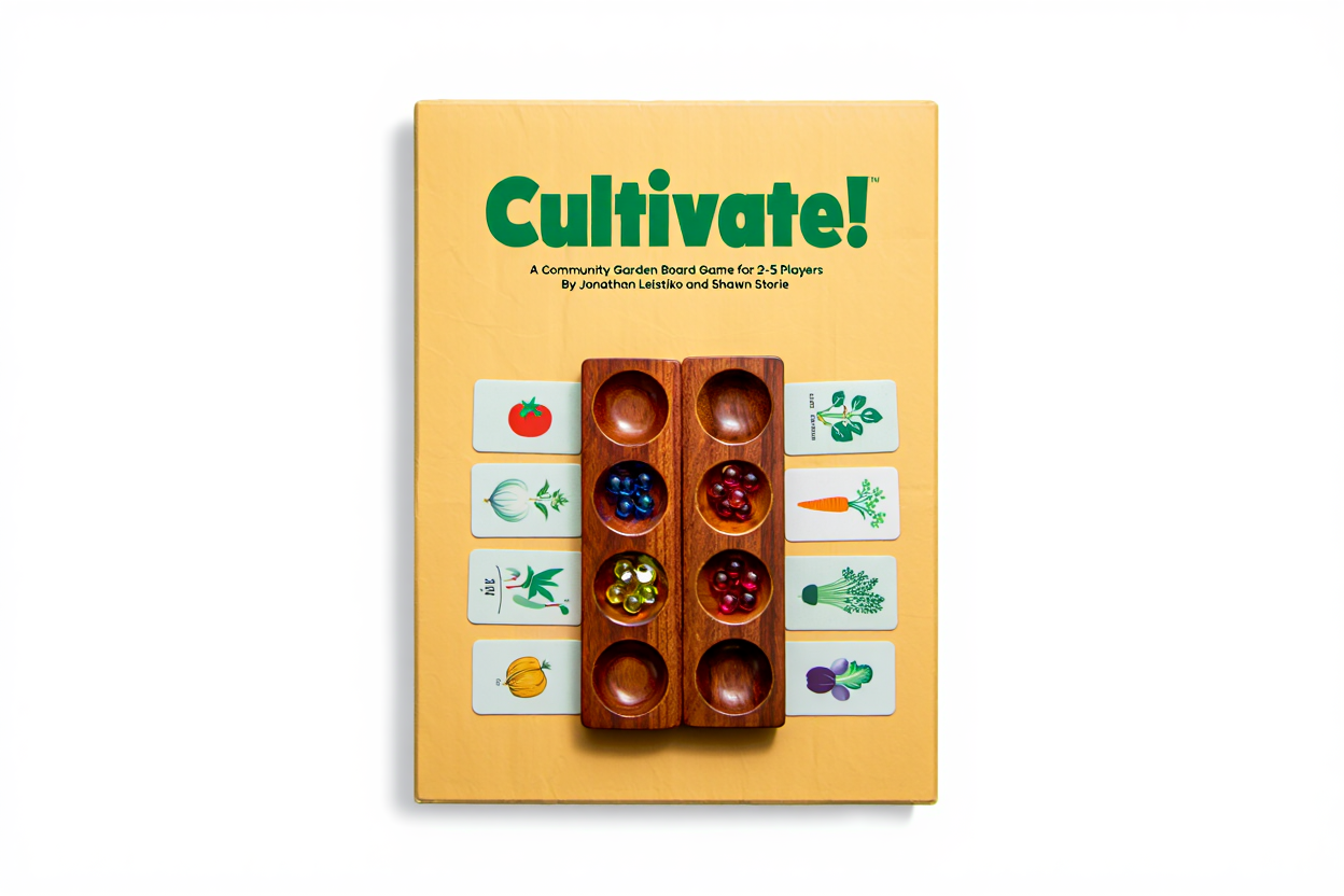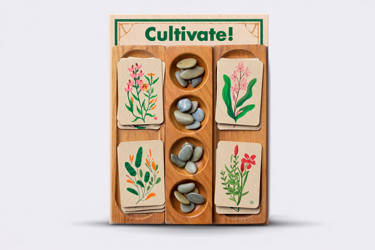 Cultivate! is a strategic board game that combines the classic sowing mechanics of Mancala with modern worker placement and engine building. Players take on roles in a community garden, planting seeds, growing relationships, and working together to create a thriving shared space across four seasons.